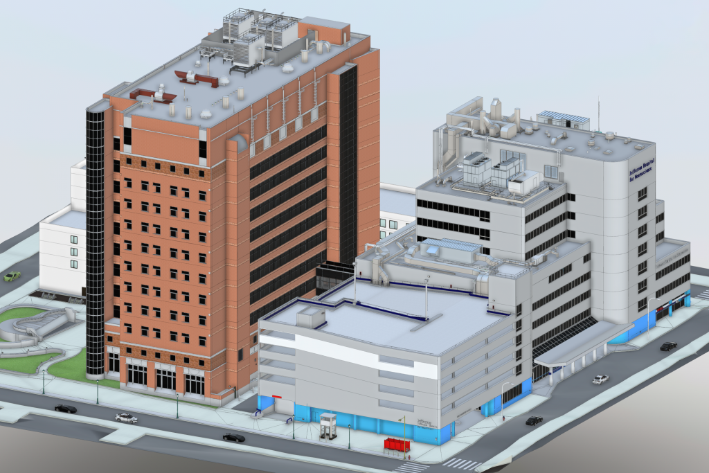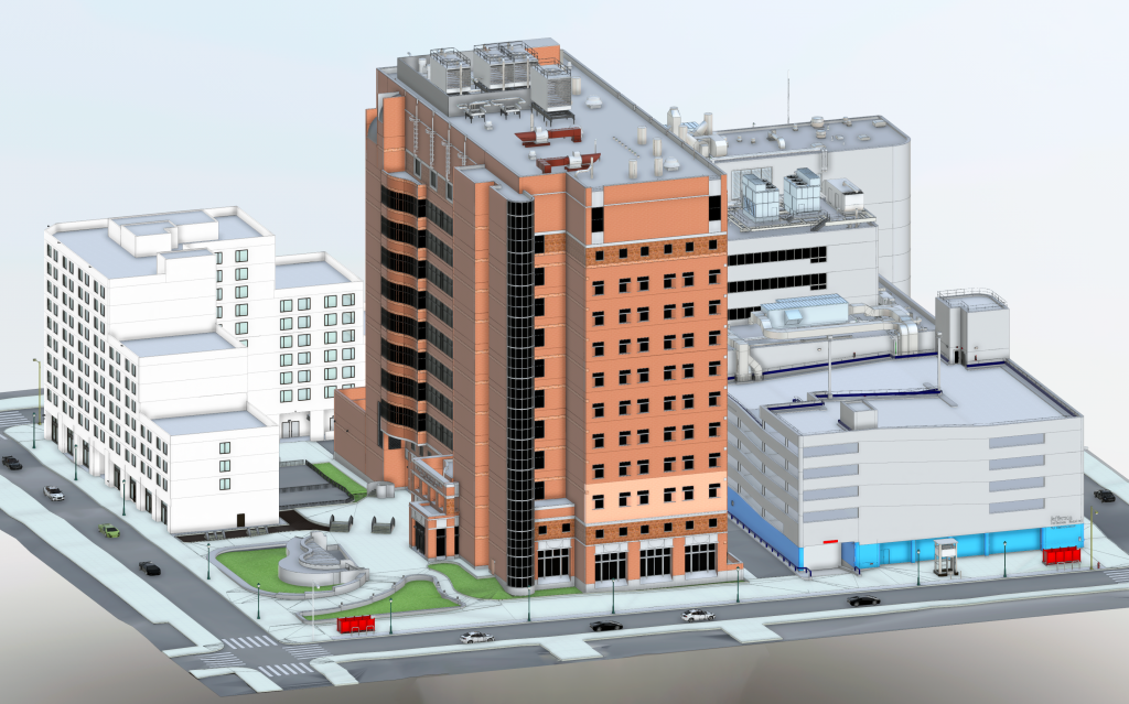 Our team was tasked with scanning and modeling the north facing wing of the building as well as the adjacent parking garage. The purpose of this project was to provide a geolocated and accurate measurement of the buildings and alley in order to construct a new wing where the old garage stood, and connect the two buildings with a sky bridge. Our team used a variety of LiDAR scanners, including a mobile LiDAR scanner as well as a terrestrial one to gather the necessary information.